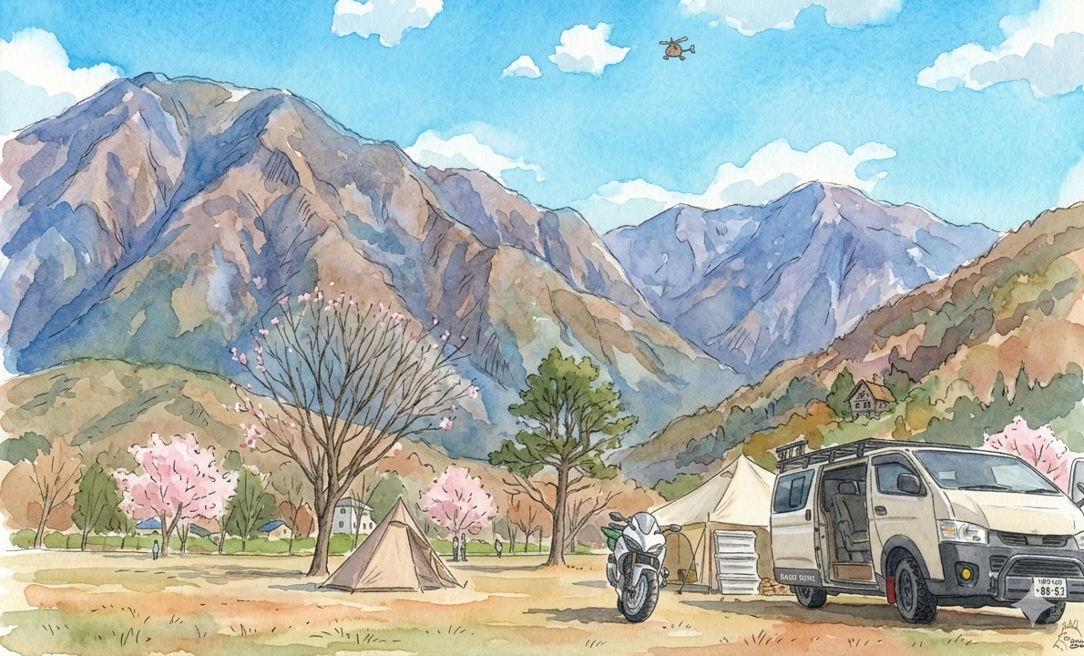新緑と山の稜線が美しい季節。気温も過ごしやすく、キャンプデビューにも最適。ただしGWは混雑ピークなので注意。